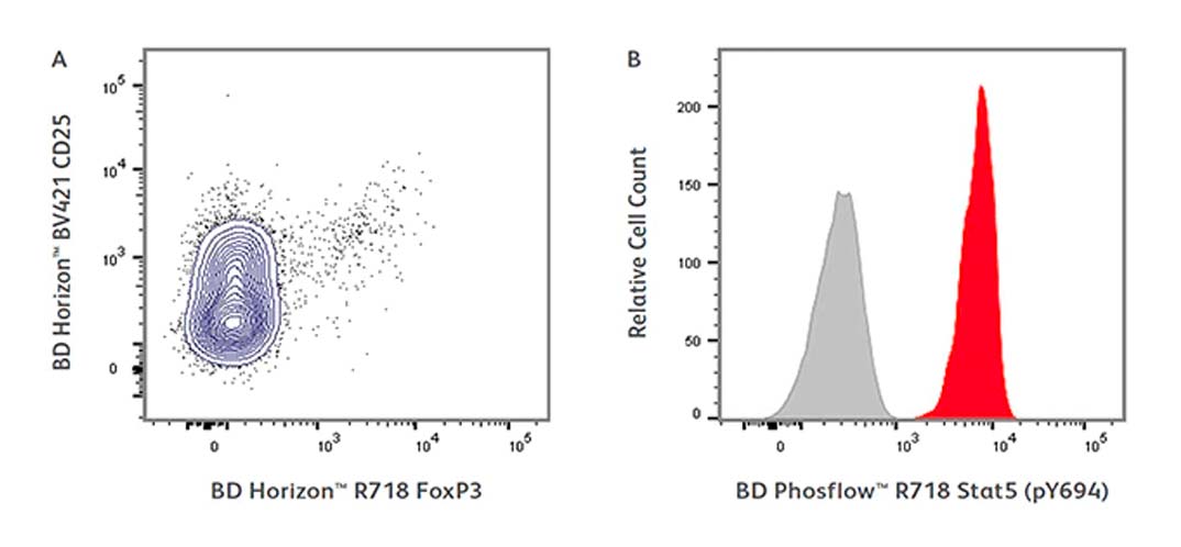 B. BD Phosflow™ Treated Human Control Cells (red) and BD Phosflow™ Untreated Human Control Cells (grey) were stained with BD Phosflow™ R718 Mouse Anti-Stat5 (pY694) (clone 47); treated and untreated control cell overlays shown here are derived from a CD4+ gate.