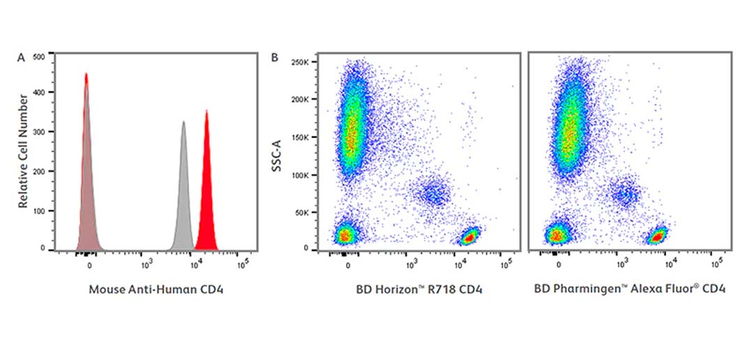 Comparison staining of CD4 on human lysed whole blood. A. Lysed whole blood stained with BD Horizon™ R718 Mouse Anti-Human CD4 (clone SK3, red) or BD Pharmingen™ Alexa Fluor® 700 Mouse Anti-Human CD4 (clone SK3, grey) shown overlaid as fluorescence histograms derived from a lymphocyte gate. B. SSC vs. fluorescence plots of BD Horizon™ R718 Mouse Anti-Human CD4 (left) or BD Pharmingen™ Alexa Fluor® 700 Mouse Anti-Human CD4 (right). All data were analyzed on a BD LSRFortessa™ X-20 Cell Analyzer with FlowJo™ Software.