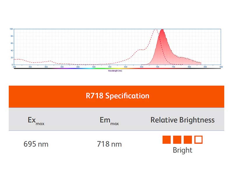 BD Horizon™ Red 718 (R718) is an innovative small-molecule fluorochrome developed exclusively for BD Biosciences. It provides improved sensitivity and resolution of low-density markers and intracellular targets. R718 is excited by the red laser with an emission maximum of 718 nm and can be detected by the same filter as Alexa Fluor™ 700.
