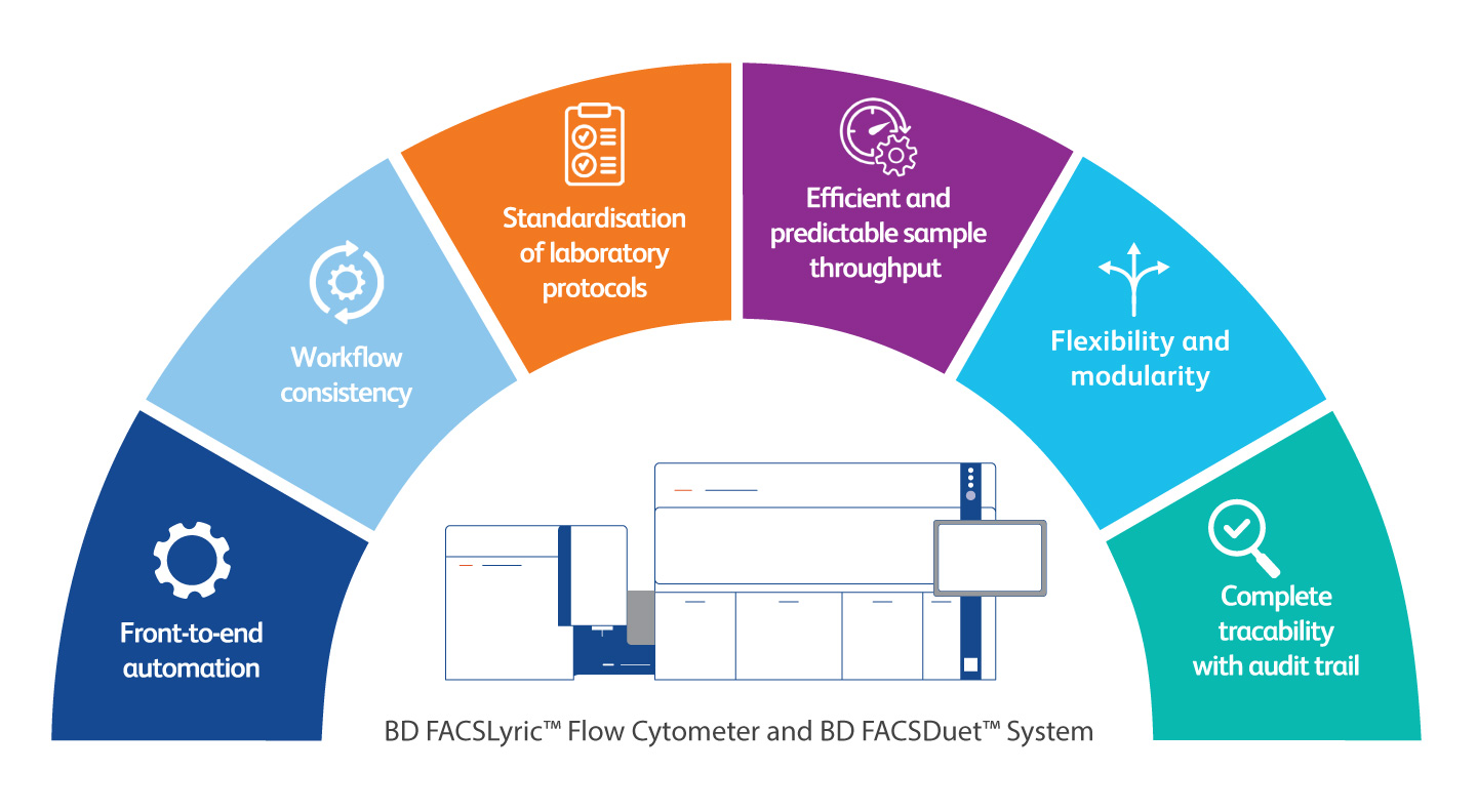 The BD FACSDuet™ Sample Preparation System and BD FACSDuet™ Premium Sample Preparation System paired with the BD FACSLyric™ Flow Cytometry System delivers process standardisation by minimising error-prone steps while increasing workflow consistency and laboratory efficiency.