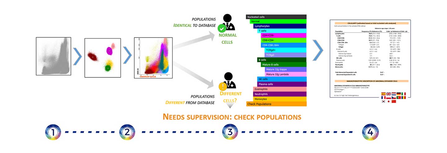 - Unique software including reference databases: EuroFlow™ databases enable automated analysis with validated reference databases allows standardisation of the process, providing reproducible and objective results