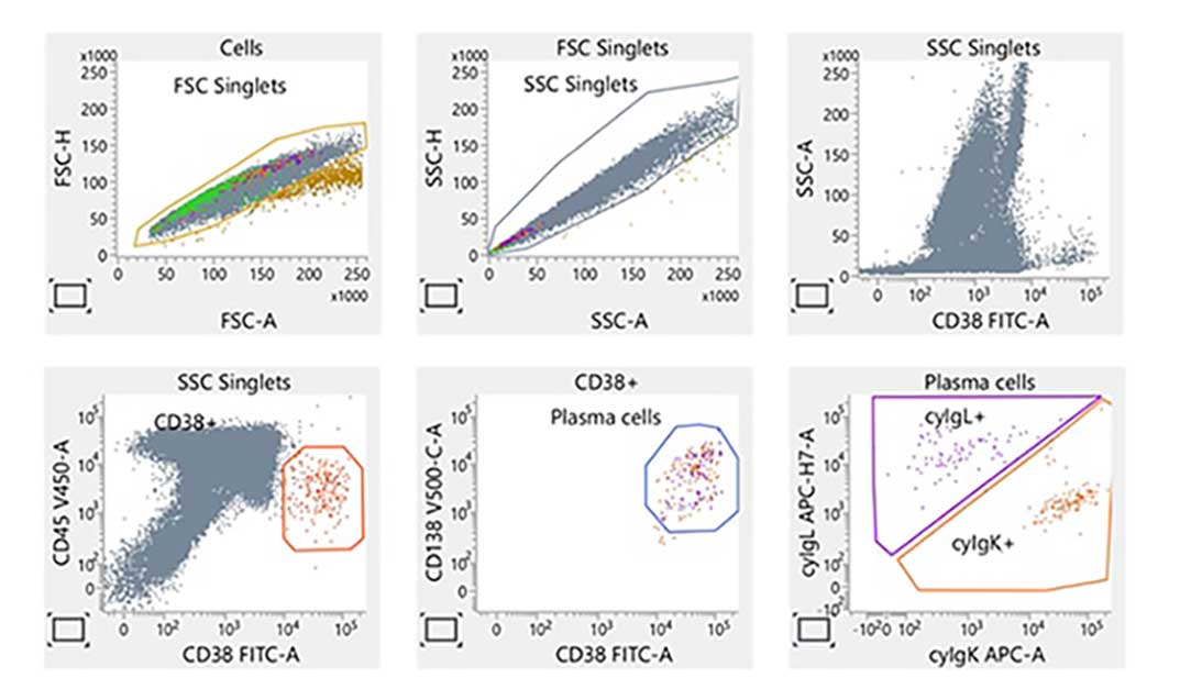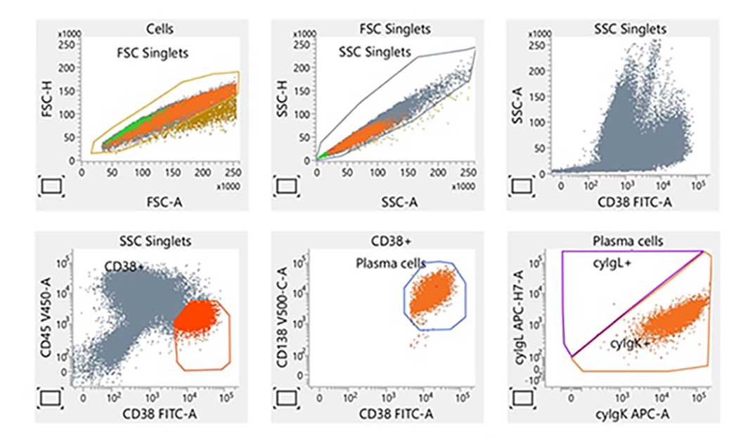 Laboratory report of an abnormal bone marrow specimen stained with the 8-color 8-antibody BD OneFlow™ PCST single-test reagent acquired on the BD FACSLyric™ Flow Cytometer with BD FACSuite™ Clinical Application v1.4 for the identification of normal polyclonal and aberrant plasma cell populations.